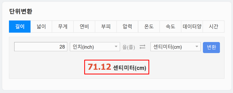 2. 28인치를 센티미터로 변환해 보았더니 71.12 센티미터가 나옵니다. 이렇게 인치를 간단하게 센티미터로 바꿔서 사이즈표를 제대로 확인 할 수 있습니다.