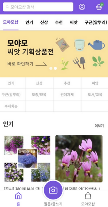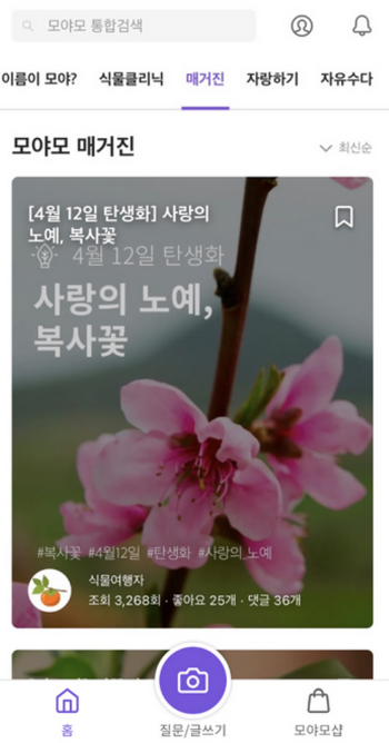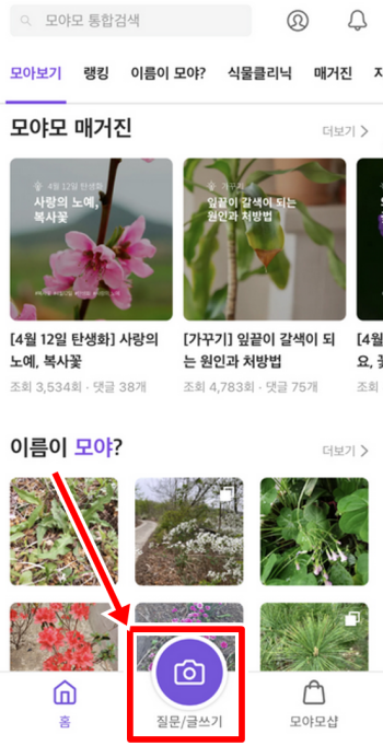 2. 가입하고 로그인한 후 꽃나무 종류나 이름을 검색하고 싶다면 화면에서 질문 또는 글쓰기 기능을 눌러주세요. 이를 통해 궁금한 식물에 대해 물어볼 수 있으며 식물을 좋아하는 많은 사람들과 소통할 수도 있습니다.