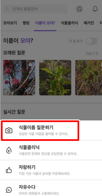 3. 질문과 글쓰기 기능을 누르면 여러 가지 선택지가 나오는데 그 중에서 식물 이름 질문하기를 선택하면 됩니다. 이 기능을 활용하면 모르는 식물의 이름을 물어볼 수 있고 다양한 사용자들이 직접 답변을 달아주는 구조로 되어 있습니다.