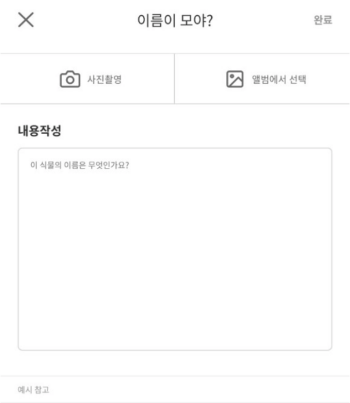 4. 직접 꽃나무를 촬영하거나 기존에 찍어둔 사진을 앨범에서 골라 업로드한 뒤 어떤 식물인지 질문을 남기면 됩니다. 사진을 올릴 때는 꽃의 형태나 잎의 특징이 잘 보이도록 하면 좀 더 정확한 답변을 받을 수 있습니다.