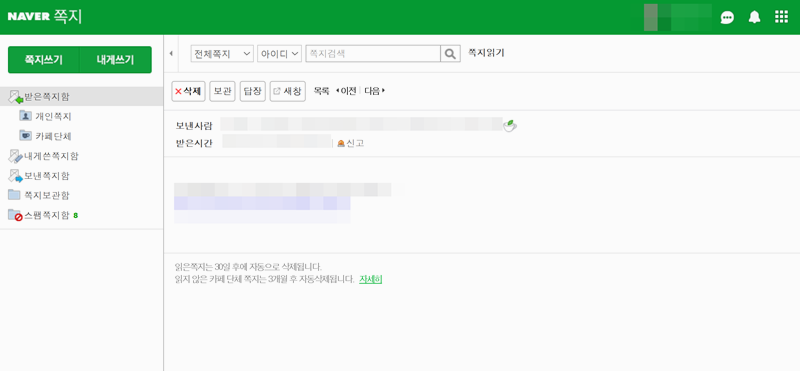 3. 쪽지를 누르면 내용을 확인 할 수 있으며 보낸 사람과 받은 시간 등을 확인 할 수 있습니다. 읽은 것은 30일이 지나면 자동으로 삭제되며 카페 단체 쪽지는 3개월 이후 자동으로 삭제가 완료 됩니다.