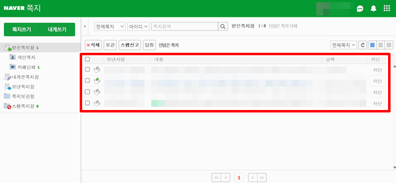 2. 네이버 쪽지함 확인은 개인, 카페 단체에서 온 것을 확인 할 수 있고 내게쓴 쪽지함, 보낸쪽지함, 스팸쪽지함 등 모든 쪽지를 확인 할 수 있습니다.