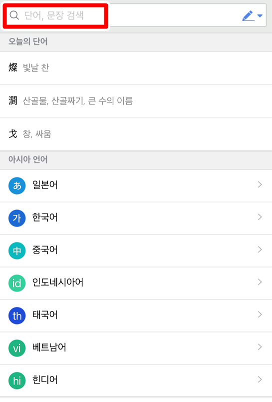3. 화면 상단에 있는 검색창을 찾아 누릅니다. 검색창이 열리면 한자를 입력할 수 있는 화면이 나타납니다. 여기서 원하는 한자를 쉽게 검색할 수 있습니다.