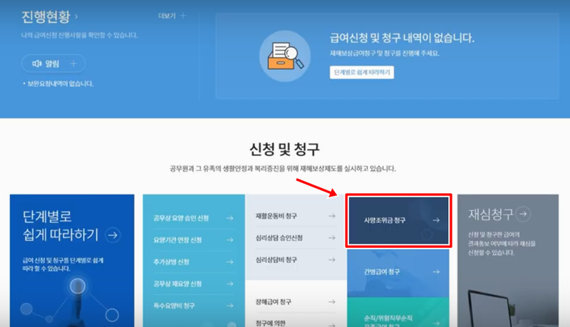 3. 로그인 후에는 종합재해금보상시스템으로 연결이되며 화면 중앙의 사망조위금 청구를 선택합니다.