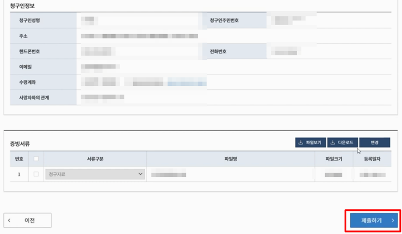 8. 마지막으로 지금까지 입력한 내용과 업로드한 서류를 확인 한 후 제출하기를 눌러서 청구를 완료 합니다.