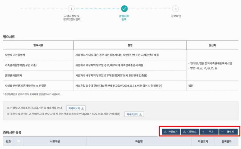 7. 그리고 사망조위금 청구를 위해 필요한 서류를 확인한 뒤 추가를 눌러서 필요한 서류를 모두 업로드 해줍니다.