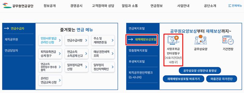 1. 다양한 공무원 연금과 관련된 정보와 서비스를 제공하는 공식 사이트입니다. 이곳에서는 연금 관련 서류 제출, 청구 절차, 각종 상담 등을 온라인으로 확인할 수 있습니다. 메인화면으로 들어오면 우측에 재해예방보상포털 카테고리를 선택한 후 사망조위금 인터넷청구 메뉴를 선택합니다.