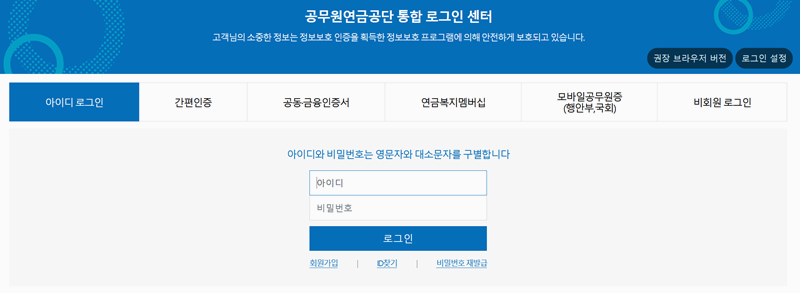 2. 선택을 마친 후에는 로그인 버튼을 눌러 로그인을 진행해야 합니다. 공무원 연금 공단 사이트는 로그인을 완료해야만 업무를 볼 수 있으니 꼭 기억해주세요. 로그인 후에는 사망조위금 신청을 할 수 있습니다.