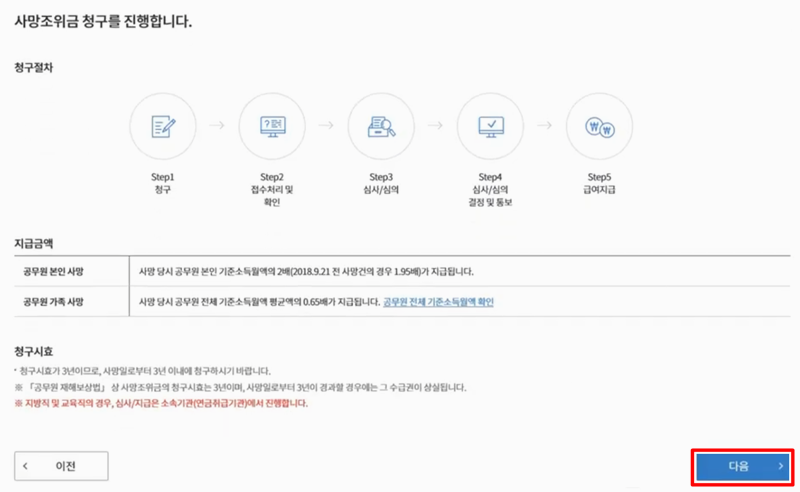 4. 지급액과 청구시효 유의사항 등을 자세히 읽어준 뒤 다음을 누르면 청구서 작성화면으로 넘어갑니다.
