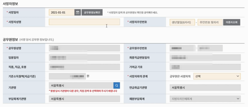 5. 사망일자를 입력하고 공무원 정보확인을 누르면 사망당시 소속기관 재직정보가 자동으로 입력되며 성명, 주민번호를 입력한 후 이중자조회를 눌러 지급된 내역이 있는지 확인 합니다. 이후 관계를 선택해주세요.