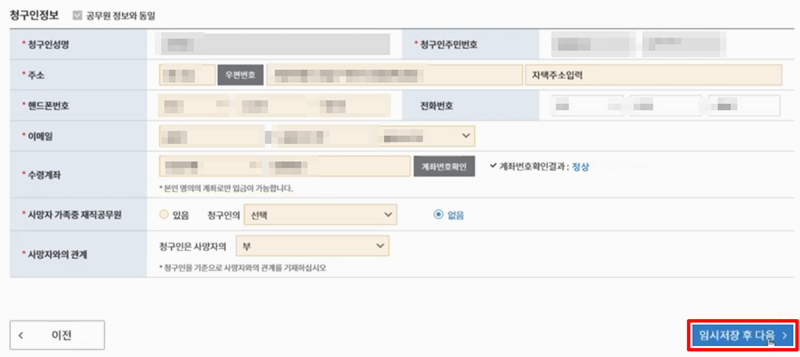 6. 이제 청구인정보를 입력하고 수령계좌를 입력해준 뒤 계좌번호 확인을 눌러줍니다. 정상계좌로 확인되면 청구가 가능하며 이때 본인 명의 계좌로만 수령 가능합니다. 모두 입력했다면 임시저장 후 다음으로 넘어가주세요.