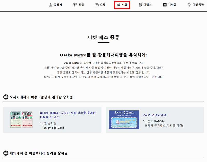 8. 지하철 이용 방법을 정리한 코너에서는 'Enjoy Eco Card' 같은 다양한 티켓 내용을 확인할 수 있어요. 칸사이 지역을 편리하게 다니는 데 도움이 돼요. 티켓과 여행에 도움 되는 팁이 담긴 곳에서는 '1일 승차권'처럼 실속 있는 이용권을 볼 수 있고 명소나 이동 경로에 관한 정보도 함께 있어서 유용해요.