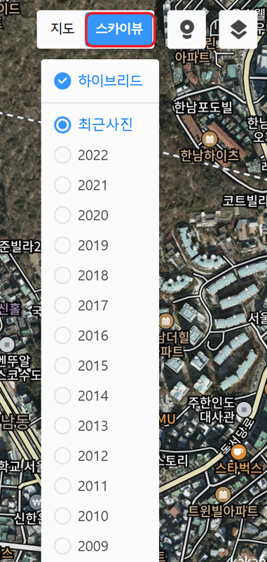 10. 스카이뷰에서는 현재 연도뿐만 아니라 과거 연도의 화면도 확인할 수 있습니다. 스카이뷰 화면 위에 마우스를 올리면 연도를 선택할 수 있는 메뉴가 나타나는데요, 원하는 연도를 선택하면 해당 시기의 항공뷰를 볼 수 있습니다. 이 기능은 과거와 현재의 변화를 비교하거나 특정 시기의 환경을 확인할 때 아주 유용합니다.