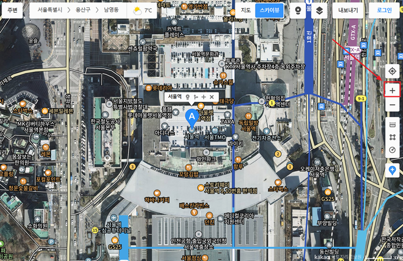 5. 화면 오른쪽에는 확대와 축소를 위한 버튼도 마련되어 있습니다. 플러스 버튼을 누르면 지도가 확대되고 마우스 스크롤로도 확대가 가능합니다. 반대로 마이너스 버튼을 누르면 지도가 축소되어 더 넓은 범위를 볼 수 있습니다.
