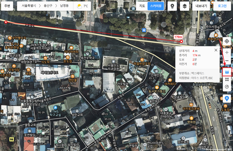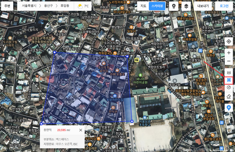 7. 지도 아래쪽에는 다양한 도구 아이콘이 있는데요, 그중 면적 재기 아이콘을 선택하면 원하는 영역의 면적을 측정할 수 있습니다. 측정하고자 하는 위치를 여러 포인트로 지정하여 원하는 만큼의 면적을 재는 것도 가능합니다.