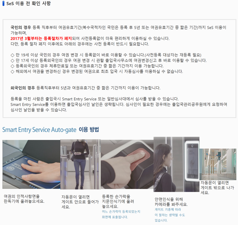 6. SeS 자동출입국심사는 등록한 국민이라면 여권 유효기간까지 사용할 수 있어요. 2017년부터는 절차가 간소화돼 사전등록 없이도 대부분 이용이 가능하지만 나이에 따라 예외도 있습니다.