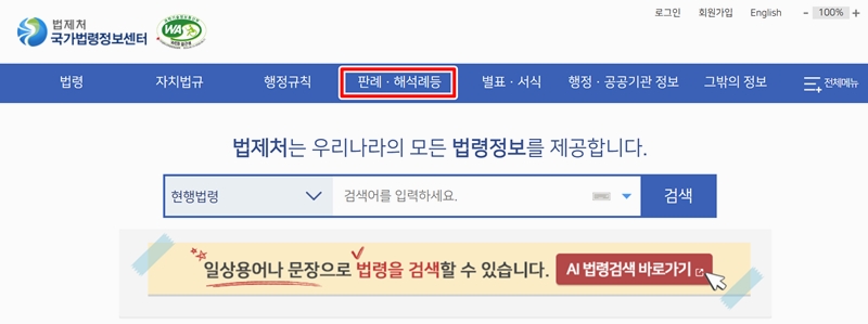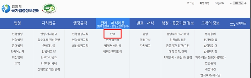 1. 각종 법령, 판례, 규정 등을 쉽게 검색하고 열람할 수 있는 온라인 서비스입니다. 법적 자료를 찾을 때 유용하게 활용할 수 있으며 다양한 법률 정보를 빠르고 정확하게 제공받을 수 있습니다. 상단 메뉴에서 판례·혜석례등을 확인 합니다.