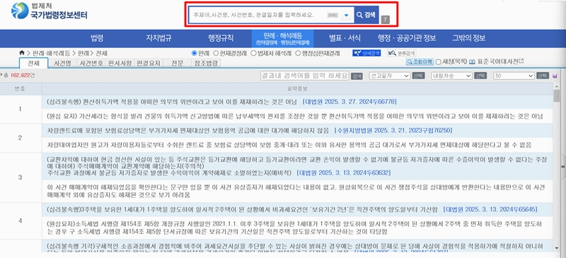 법적인 문제를 해결할 때 매우 유용한 사이트 입니다. 사건 번호나 판결 날짜, 법령 등을 기준으로 판례를 검색할 수 있어 원하는 정보를 쉽게 찾을 수 있습니다. 판례를 통해 법원의 판단 근거를 알게 되면 유사한 상황에서 어떻게 대응해야 할지에 대한 중요한 단서를 얻을 수 있습니다. 복잡한 법적 내용을 간단히 파악할 수 있어 법적 판단을 내리기 전에 참고하기 좋습니다. 대법원 판례검색은 국가법령정보센터 홈페이지에서 알아볼 수 있습니다.