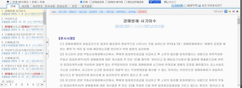 3. 이제 검색창에 알아보고자 하는 내용을 입력합니다. 이렇게 하면 관련된 판례들이 빠르게 검색되어 나옵니다. 정확한 검색어를 입력하면 더 쉽게 원하는 판례를 찾을 수 있습니다.
