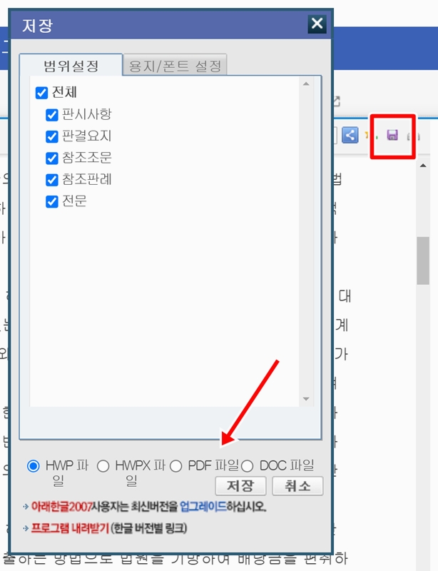 6. 확인하고 싶은 판례를 찾았다면 우측의 저장 버튼을 눌러 저장합니다. 저장된 판례는 나중에 다시 열어볼 수 있어 유용합니다. 판례를 저장하면 필요할 때마다 쉽게 확인할 수 있습니다.