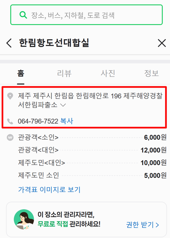 2. 배를 타는 곳 주소도 정확히 나와 있어서 길 찾기가 쉬워요. 주소는 제주 제주시 한림읍 한림해안로 196이고 네비게이션에 입력하면 바로 안내돼요. 전화로도 예약이나 문의가 가능하고 요금도 함께 확인할 수 있어요.