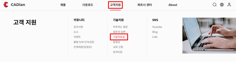 2. 고객지원 메뉴 안에 기술지원이라는 항목이 있어요. 그걸 누르면 기술자료실로 들어갈 수 있어요. 프로그램과 관련된 다양한 자료들이 모여 있어서 dwg뷰어도 바로 찾을 수 있죠.