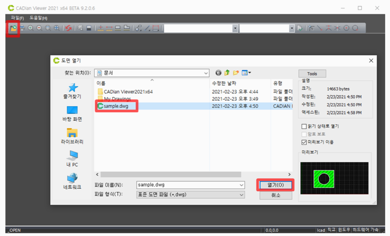 6. 설치가 완료되면 프로그램을 켜서 열기 기능으로 dwg 파일을 선택해보세요. 도면이 화면에 표시되고 마우스로 확대, 축소, 이동도 부드럽게 할 수 있어서 보는 데 불편함 없어요.