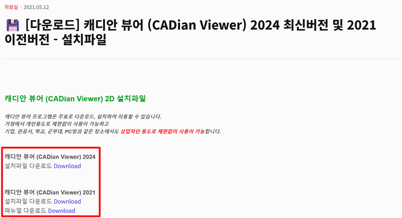 4. CADian Viewer 설치 파일 옆에 있는 다운로드 항목을 눌러서 파일을 받아주세요. 설치 파일이 간단하게 정리돼 있어서 헷갈릴 일 없이 바로 내려받을 수 있어요.