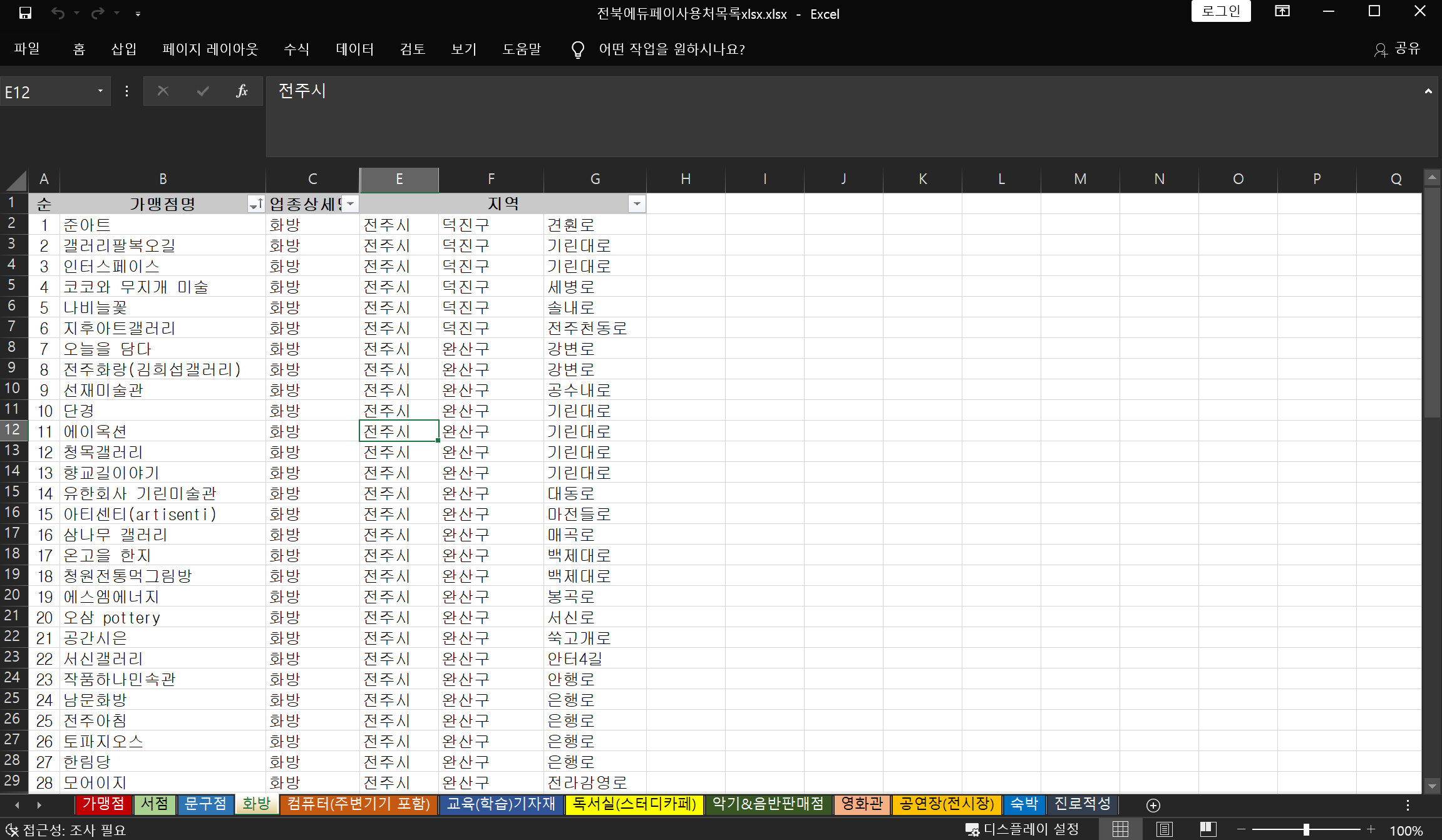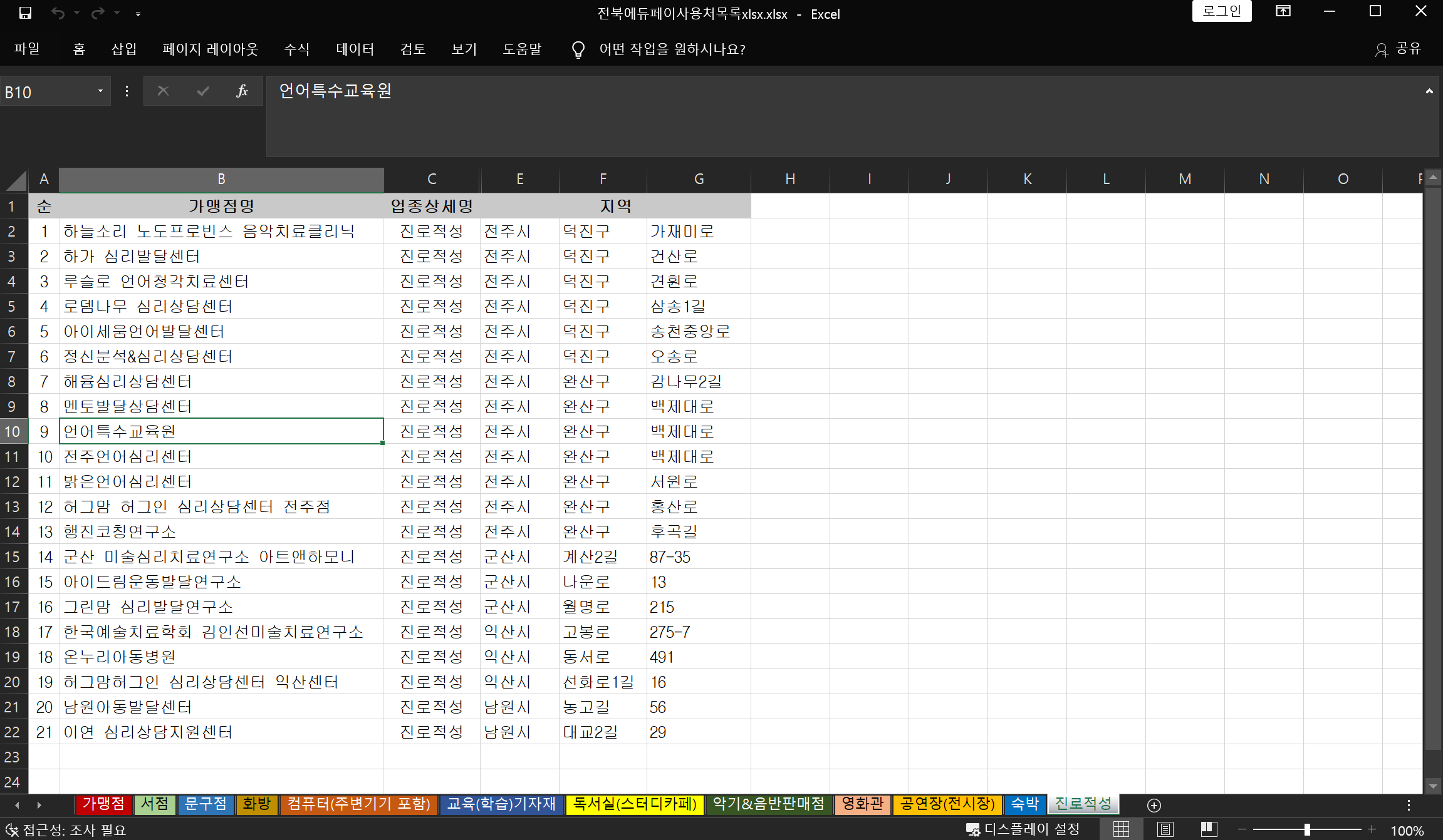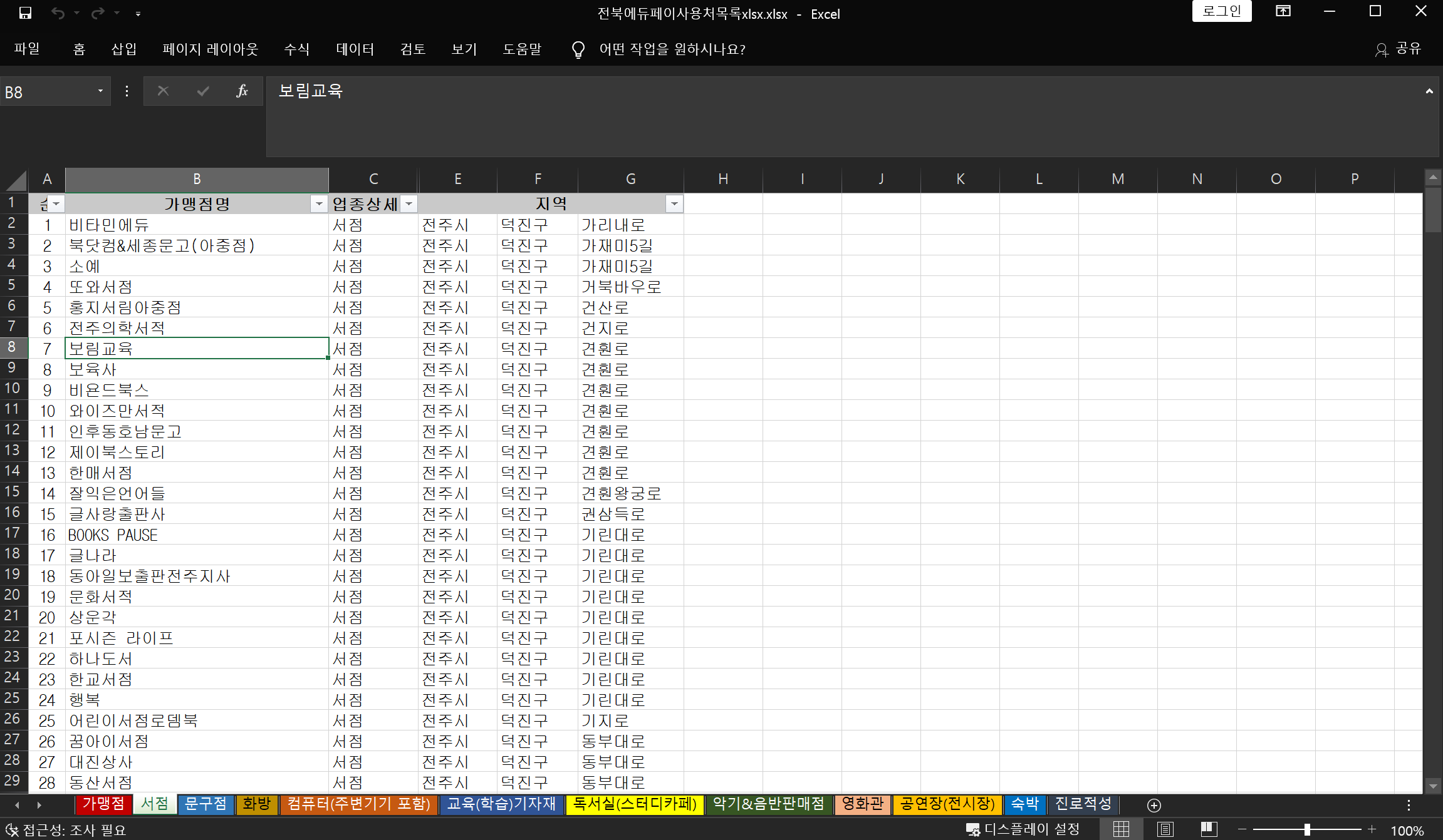 전북 에듀페이는 교육비 지원을 위한 카드로, 학원, 서점, 문구점 등 다양한 교육 관련 업종에서 사용할 수 있습니다. 하지만 정확한 가맹점 목록이나 사용처에 대한 정보는 공식적인 자료를 통해 확인하는 것이 가장 확실합니다. 전북 에듀페이 사용처 가맹점은 아래의 파일에서 알아볼 수 있습니다.