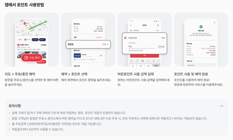 8. 앱에서 포인트를 사용하려면 주유소나 충전소를 선택하고 예약 후 포인트 금액을 입력해 사용합니다. 예약 완료 후 현장에서 서비스를 이용할 수 있습니다. 부정 적립은 인정되지 않으며, 동일한 주유소에서 6시간 이내 두 번 주유 시 첫 번째만 적립됩니다. 적립된 포인트는 5년 내에 사용해야 합니다.