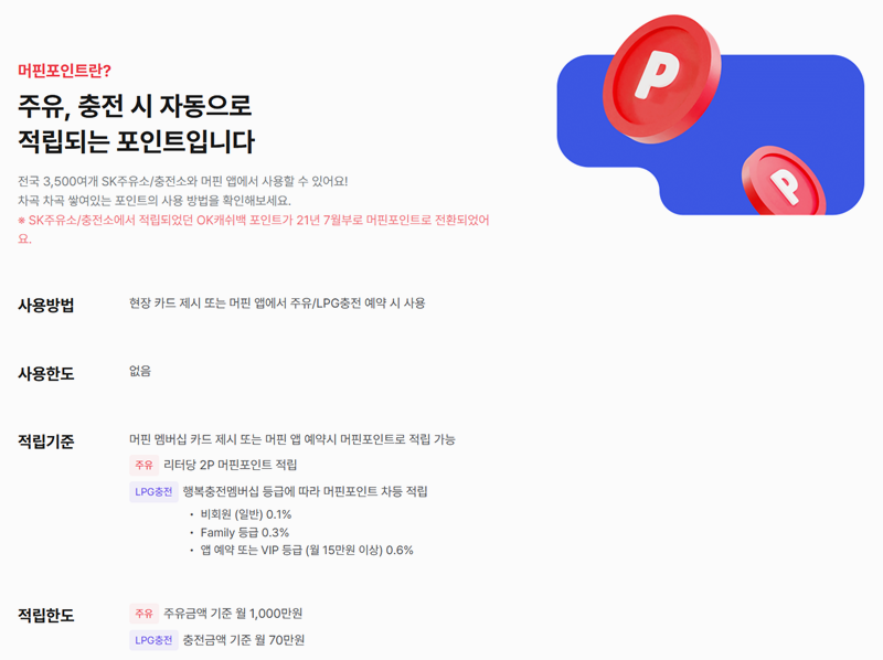 7. 머핀포인트는 주유와 충전 시 자동으로 적립되는 포인트로 전국 3,500여 개 SK주유소와 충전소, 머핀 앱에서 사용할 수 있습니다. 머핀 멤버십 카드 제시나 앱 예약 시 적립되며 주유는 리터당 2포인트, LPG충전은 멤버십 등급에 따라 다르게 적립됩니다. 사용 한도는 주유는 월 1,000만원, LPG충전은 월 70만원까지 가능합니다.