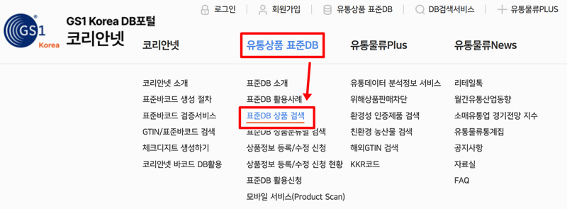 5. 혹시 바코드가 없거나 숫자를 모를 땐 상품명이나 회사명으로 검색해도 괜찮아요. 상단에 있는 유통상품 표준DB 메뉴에서 표준DB 상품 검색을 이용하시면 됩니다.