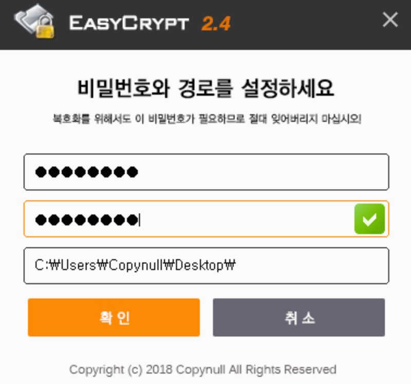 5. 암호화할 파일을 정하고 나면 원하는 비밀번호를 입력하는 창이 나옵니다. 여기서 본인이 원하는 비밀번호를 적고 확인을 누르면 곧바로 암호화가 시작돼요. 암호는 최대 128자까지 입력할 수 있어서 조금 더 강력한 보안을 원하신다면 긴 비밀번호로 설정해두는 것도 좋은 방법입니다.