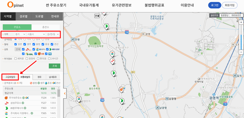 2. 지역을 고른 다음에는 고급휘발유 항목에 체크만 해주면 고급 휘발유를 취급하는 주유소만 따로 정리돼요. 목록에서 일반 휘발유 주유소는 제외되니 필요한 곳만 한눈에 볼 수 있어서 시간 절약에도 딱입니다.