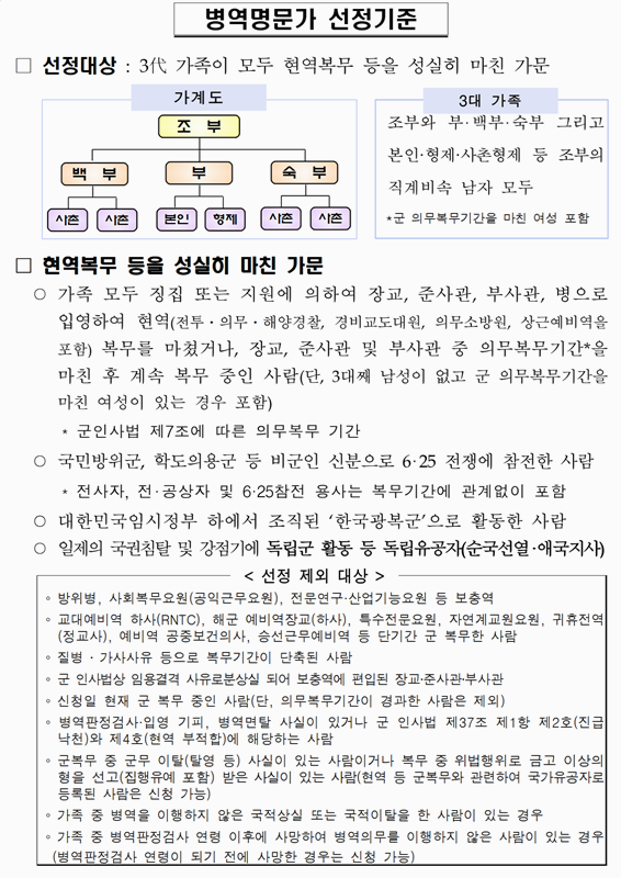 5. 병역명문가는 매년 선정이 이뤄지니까 본인이나 가족이 조건에 맞는지 확인하고 해당된다면 꼭 신청해두는 게 좋아요. 자격 확인은 어렵지 않으니 부담 갖지 말고 알아보셔도 좋습니다.