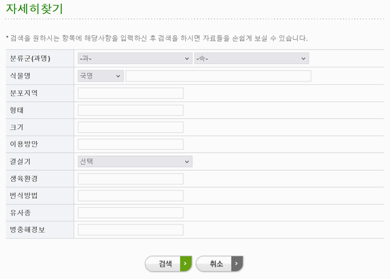 3. 자세히 찾기 기능을 활용하면 식물명, 분포지역, 형태, 크기, 이용방안 같은 세부 항목으로도 검색할 수 있어요. 결실기나 생육환경, 번식방법, 병충해 정보까지 찾을 수 있어 식물에 대해 더 깊이 알아볼 수 있죠.
