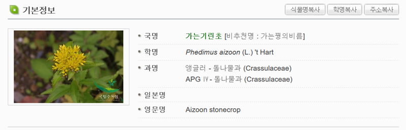 4. 궁금한 식물의 사진을 찾아보면 기본 정보란에 국명과 학명, 과명 같은 기본적인 식물 정보가 함께 나와요. 덕분에 이름뿐만 아니라 이 식물이 어떤 분류에 속하는지도 자연스럽게 확인할 수 있어요.