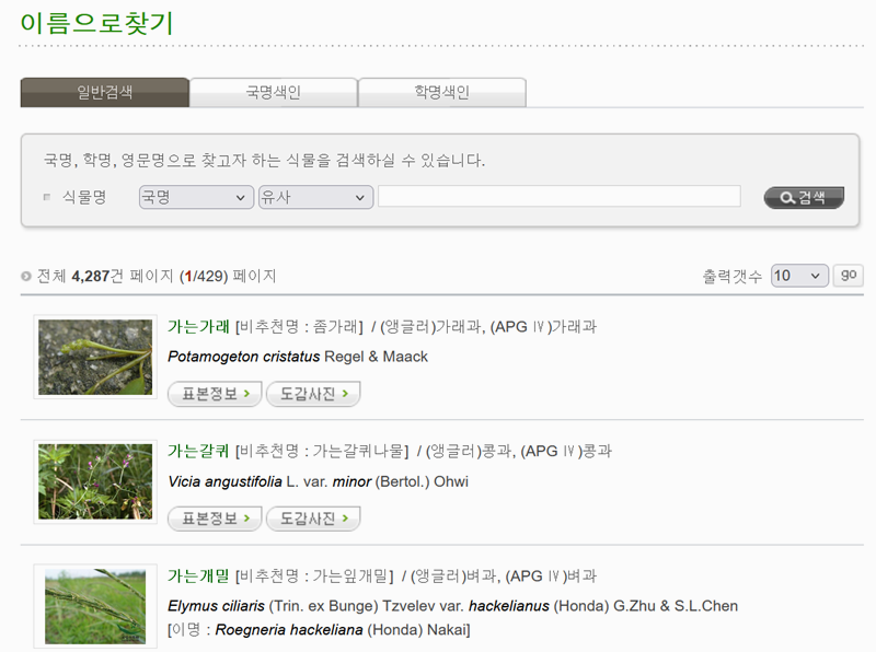 2. 식물도감에서는 일반 검색은 물론 국명이나 학명으로도 검색이 가능해요. 이름을 정확히 모르더라도 한글 이름이나 학명을 알고 있다면 그걸 입력해 바로 정보를 찾아볼 수 있어 검색 과정이 간편해요.
