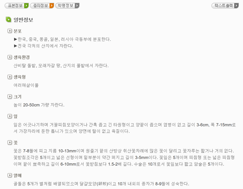 5. 일반정보 항목에서는 그 식물이 자라는 분포 지역이나 생육환경, 크기, 꽃의 형태 같은 다양한 세부 내용을 확인할 수 있어요. 덕분에 키우는 데 필요한 환경이나 관리 방법을 알아볼 때 유용하게 쓸 수 있죠.
